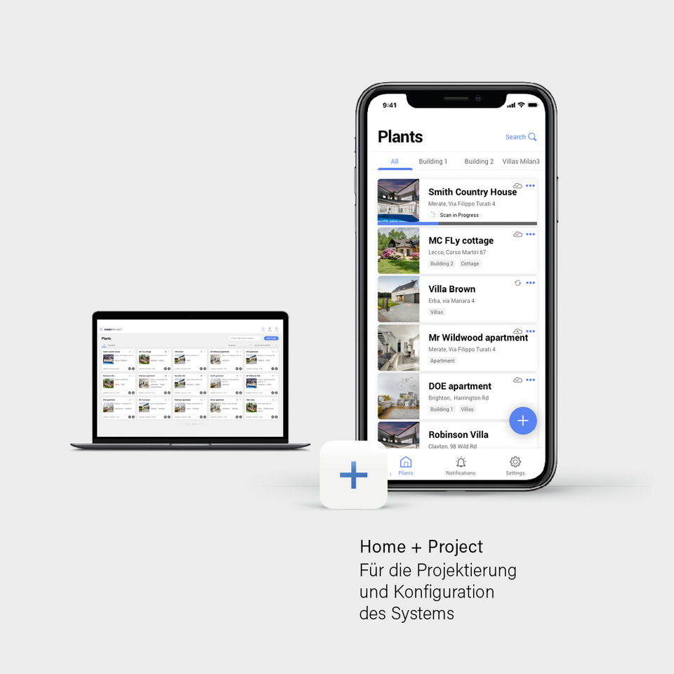 Mit der Home + Project App können Sie alle elektrischen Geräte in Ihrem Zuhause miteinander verknüpfen und Ihr Hausautomationssystem bequem in Betrieb nehmen – und das ganz ohne PC-Software! Die App führt Sie Schritt für Schritt durch die Konfiguration, sodass alles einfach und selbsterklärend wird. Sobald Sie ein Projekt erstellen, erhalten Sie sofort Zugriff auf die Gesamtansicht Ihrer Anlage: Räume, installierte Geräte, Servereinstellungen, erstellte Szenarien und mehr. Sie können den Status überprüfen, Änderungen vornehmen (Räume und/oder Geräte hinzufügen oder entfernen usw.) und Notizen sowie Dokumente hinterlegen. Die Nutzung der Home + Project App erfordert lediglich, dass Ihr Smartphone/Tablet mit demselben lokalen WLAN verbunden ist wie Ihr Server. Den MyHOME-Server können Sie entweder in Ihrem Verteilereinbaukasten platzieren oder die Server-Funktion mit der Classe 300EOS with Netatmo erhalten. Nach Abschluss der Inbetriebnahme steht Ihnen automatisch die Home + Control App zur Verfügung. Damit können Sie Ihre Produkte bequem von zu Hause oder unterwegs aus verwalten, maßgeschneiderte Szenarien erstellen und einrichten.